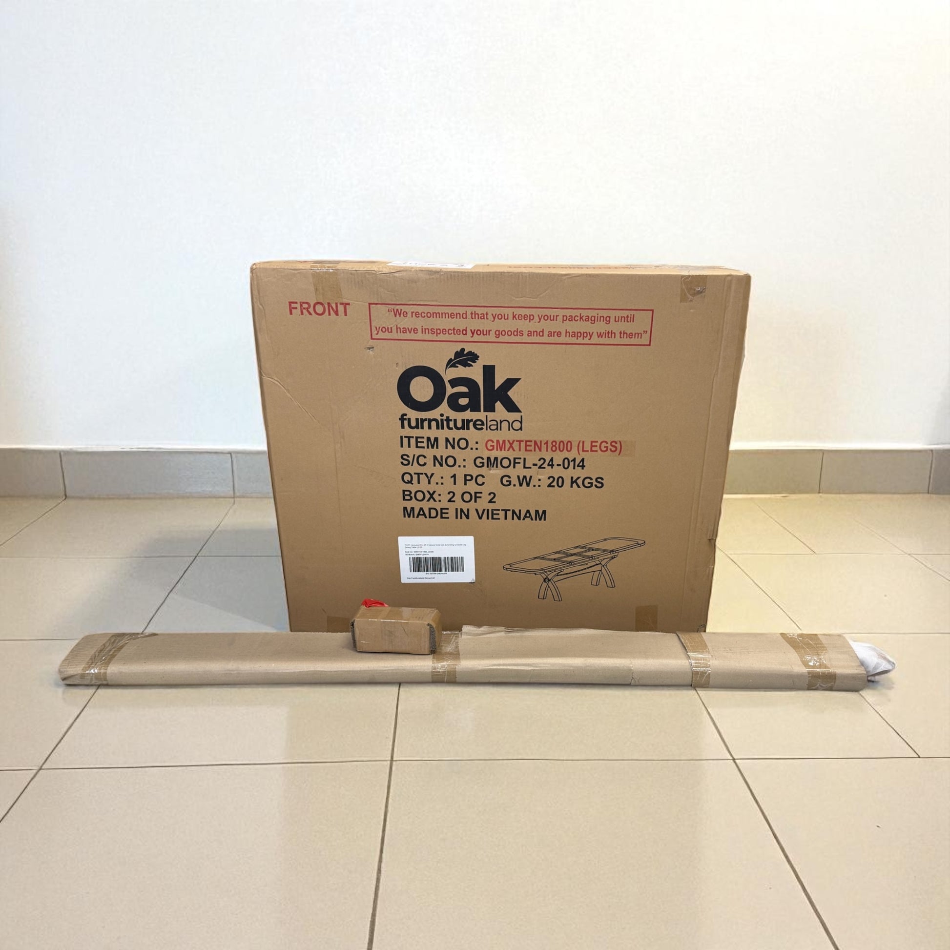 The first two images are stock photos, while the others are actual photos of the table. The legs, crossbar and the wooden pins are all still in their original packaging.